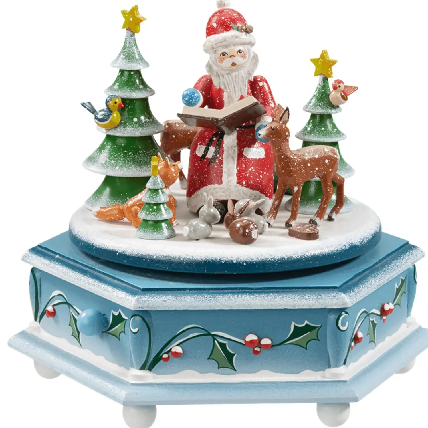 Drausen Im Wald, Abseits Des Weihnachtlichen Treibens Im Dorf Freuen Sich Die Die Tiere Des Waldes Uber Den Besuch Des Weihnachtsmannes. Sitzend Neben Kleinen Tannen Mit Sternenspitzen Liest Er Ihnen Eine Weihnachtsgeschichte Vor. Gespannt Und Voller Freude Lauschen Reh, Fuchs, Haschen Und Vogel Der Geschichte In Dieser Winternacht. Die Musikdose Ist Mit Blattern Der Stechpalme Und Deren Beeren Hubsch Verziert – Eine Bezaubernde Szene Fur Ihre Personliche Winterwelt.