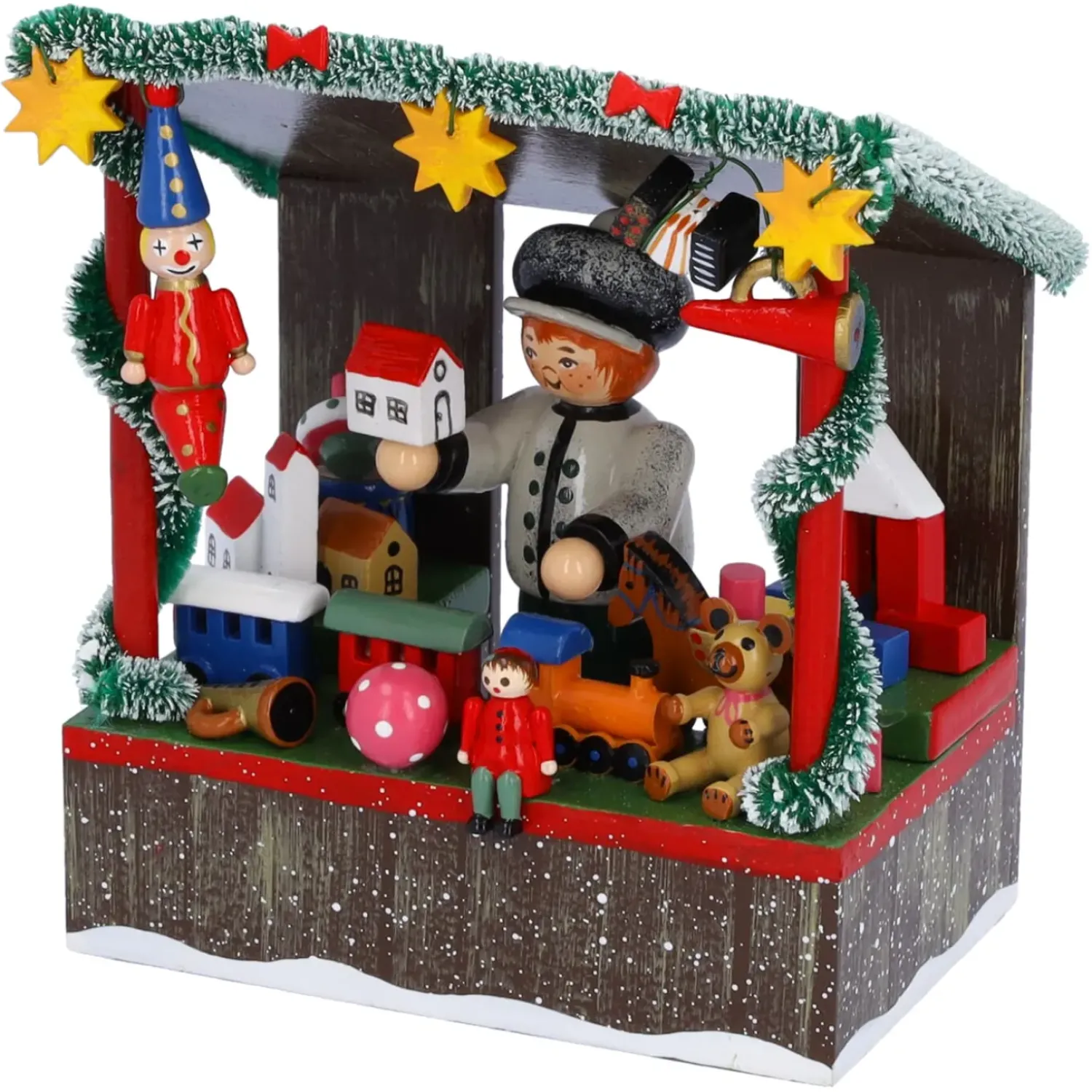 Farbenprachtige Spielwaren Werden In Diesem Weihnachtlich Dekorierten Verkaufshauschen Angeboten. Beim Bummel Uber Den Weihnachtsmarkt Und Auf Der Suche Nach Einem Passenden Geschenk Fur Lisa Und Tim Wird Man Hier Fundig Werden. Ball, Puppe, Teddybar, Spielzeuglokomotive, Bausteine, Spielhauschen Und Instrumente Bietet Der Nette Handler Feil. Was Stand Da Nochmal Auf Dem Wunschzettel Der Kinder?